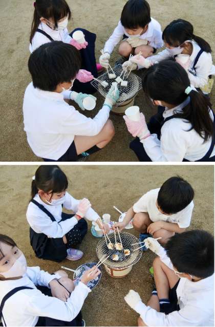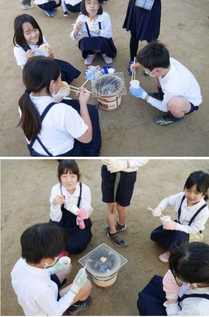 3年七輪体験で、やっと炭に火がつきました。なかなか火をつけるのはむずかしいですね。炭があかあかと燃え出したところで、網をおいて、おもちを焼きました。少し焦げ目がついてふくれたら、しょうゆをつけて食べました。とってもおいしいですね。一味ちがいます。
