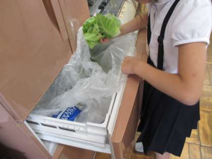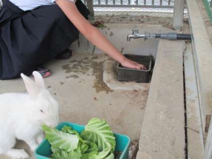 職員室の冷蔵庫にあるウサギのエサ(キャベツの外側の葉など)を取りに来て、毎日、餌やりと小屋の中の掃除をしています。