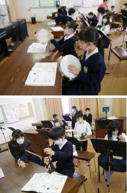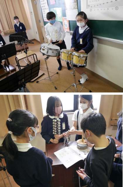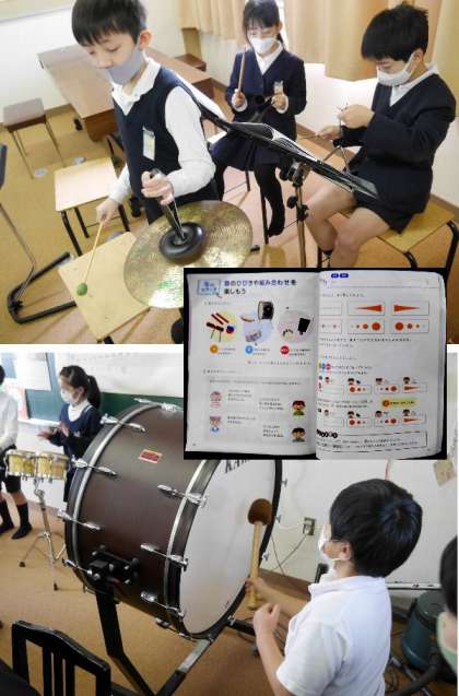 3年生の音楽では、木でできた楽器、皮をはった楽器、金属でできた楽器など、いろいろな楽器の音をたしかめていました。打ち方をかえたり、ばちなどをかえて、どんな音がでるか楽しみました。