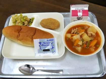 今日の献立は、チキンレバーカツ、たことキャベツのバジルソテー、ケチャップ煮、コッペパン、ブルーベリージャム、牛乳でした。