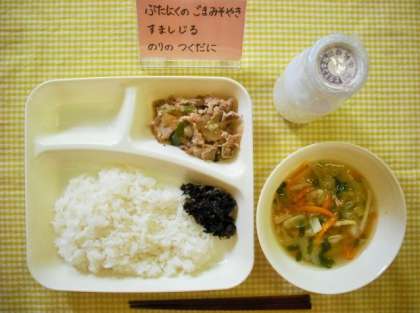 今日の献立は、「豚肉のごまみそ焼き、すまし汁、のりのつくだ煮、ごはん、牛乳」です。 のりのつくだ煮は、干ししいたけ、かつおぶし、きざみのりをみりん、しょうゆなどで甘辛く味付けして煮つめたものです。ごはんがすすむおかずで、今日のごはん残食はゼロでした。