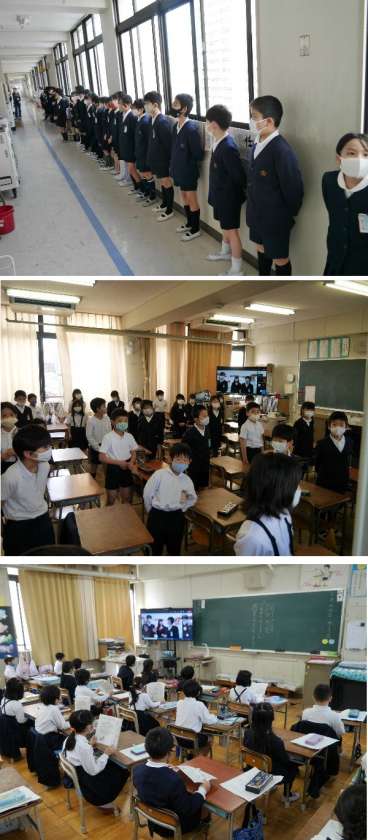 延期になっていた6年生をおくる会を、オンラインで行われました。児童代表のあいさつのあと、6年生の感謝の気持ちをこめたスライドショーの発表がありました。最後に全学級で「さよなら東都の6年生」を歌いました。5年生は、6年生の教室前で歌ってくれました。