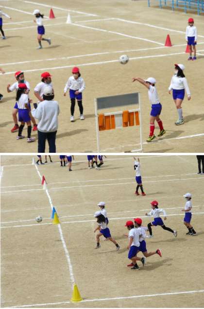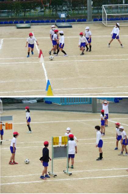 3年生の体育でも、サッカーボールをしています。とても白熱してもりあがっていました。