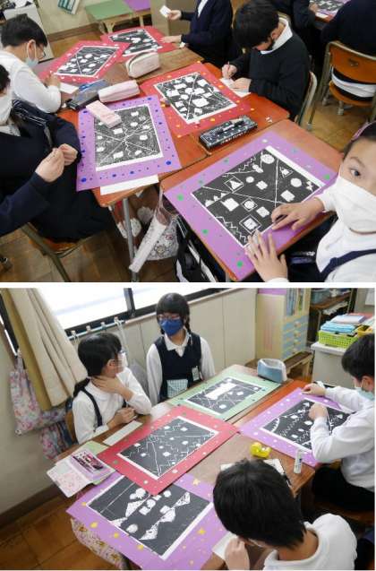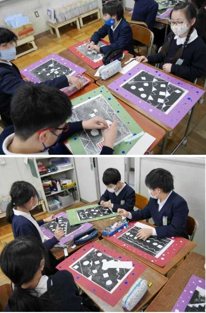 4年生では、作った版画を画用紙にはって仕上げていました。