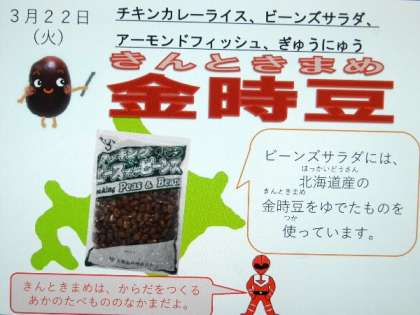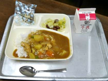 今日の献立は、チキンカレーライス、ビーンズサラダ、アーモンドフィッシュ、牛乳でした。やっぱりみんな大好きですカレーライス。たくさんいただきました。