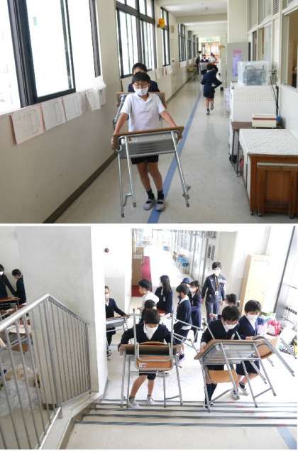 新年度の新しい学級のために、教室の机といすの大きさや数の調整をするために移動しました。4年生と5年生が手伝ってくれました。ありがとうございましす。