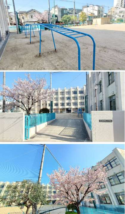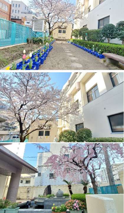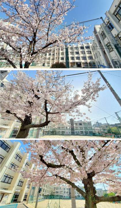 春の陽気で、校庭の桜も見事に開花しています。とてもきれいな校庭です。