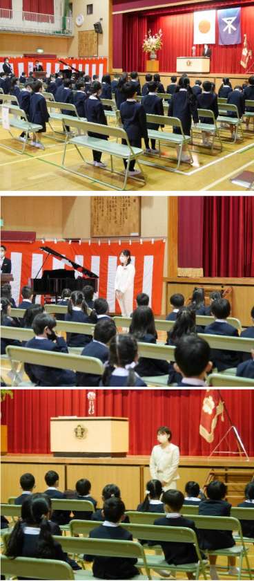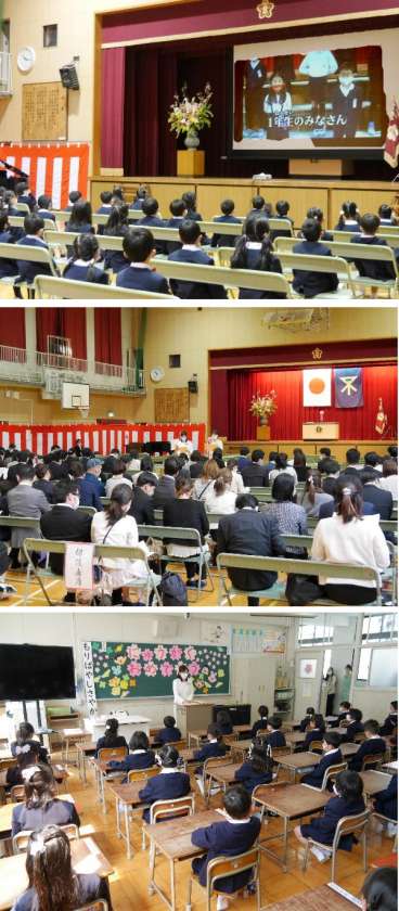 担任の先生や1年生に関わる先生を紹介したあと、2年生からのビデオメッセージを見て、校歌を聞きました。