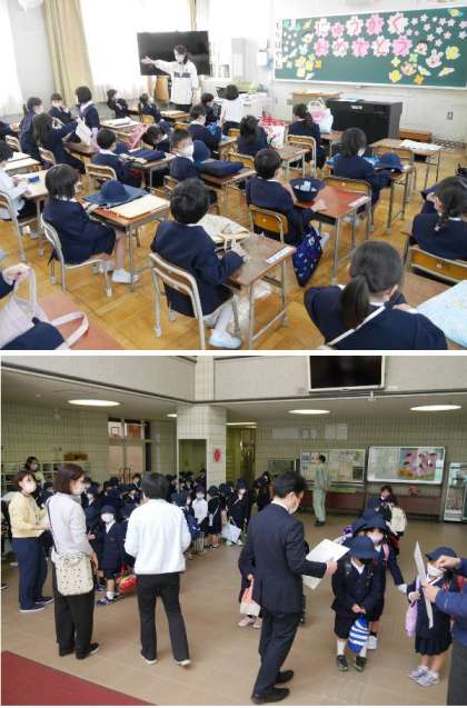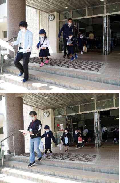 1年生は、しばらくの間は、先生がたが地域ごとに一緒に集団下校します。早く学校の生活になれてくださいね。来週から給食も始まりますよ。