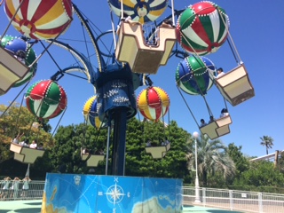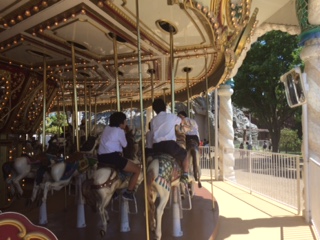班に分かれて、アトラクションやパレードなどで仲良く楽しんでいます。雲ひとつない快晴の下、みんな元気に活動しています。