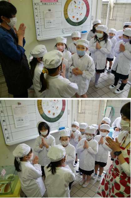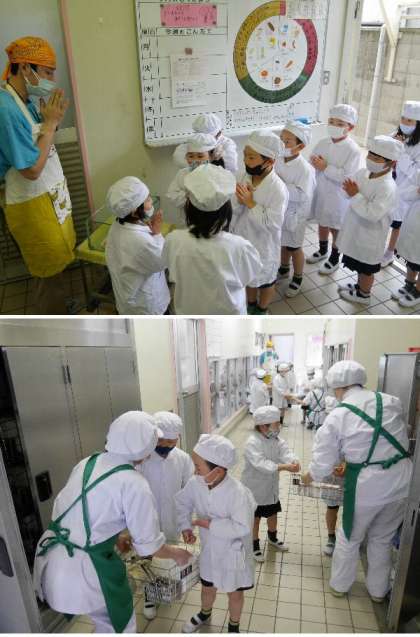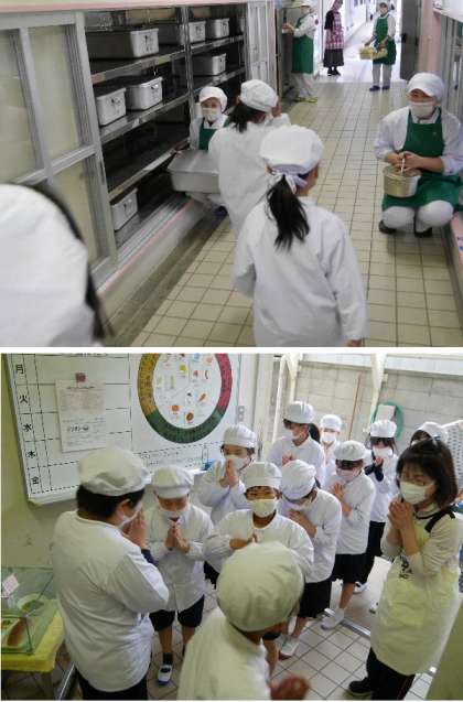 今日から、おいしい給食の始まりです。給食調理員さんに感謝の「いただきます」をして、食缶を運びます。