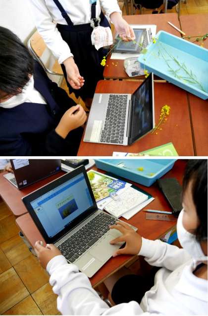 5年生の理科では、花のつくりについて調べていました。校庭の菜の花を直接観察して、タブレットに写真をとってまとめていました。