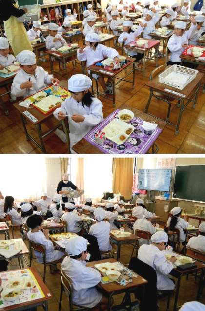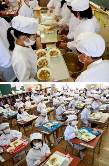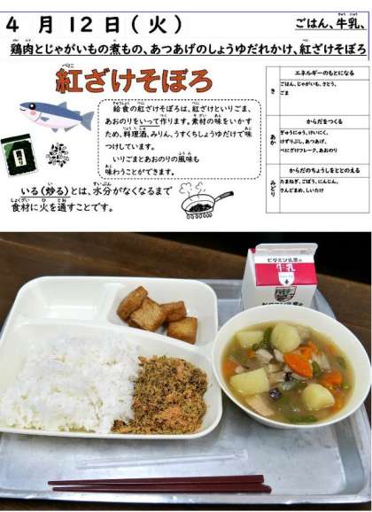 今日の献立は、鶏肉とじゃがいもの煮物、あつあげのしょうゆだれかけ、紅さけそぼろ、ごはん、牛乳でした。