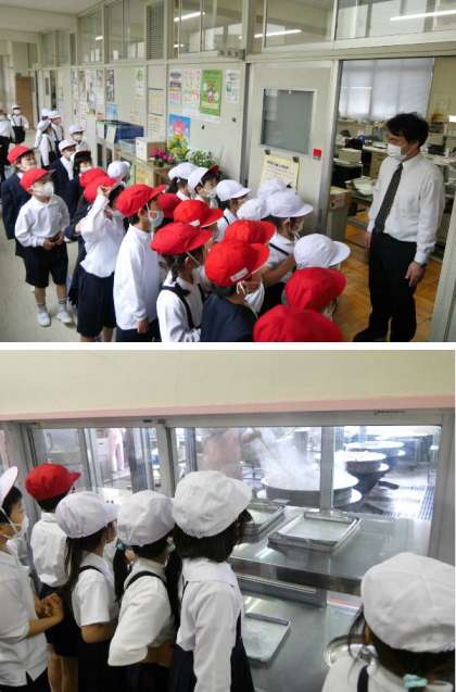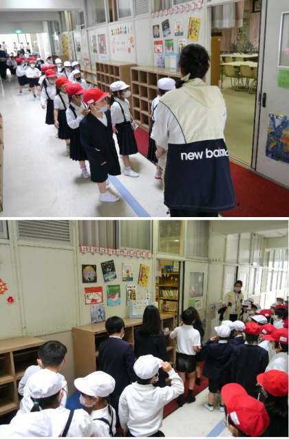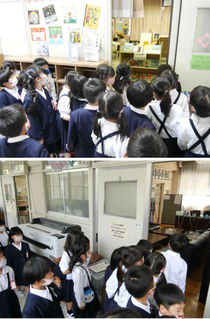 1年生は校舎探検で、よく利用する部屋を見て回りました。4階の図書室、2階の職員室、1階の給食調理室、保健室、管理作業員室などを回りました。