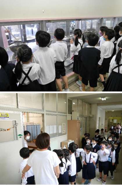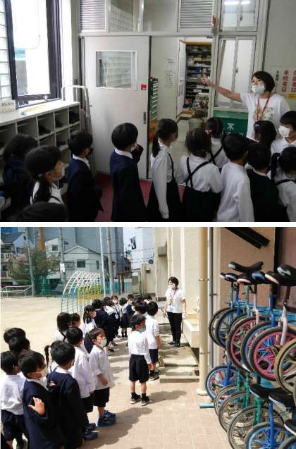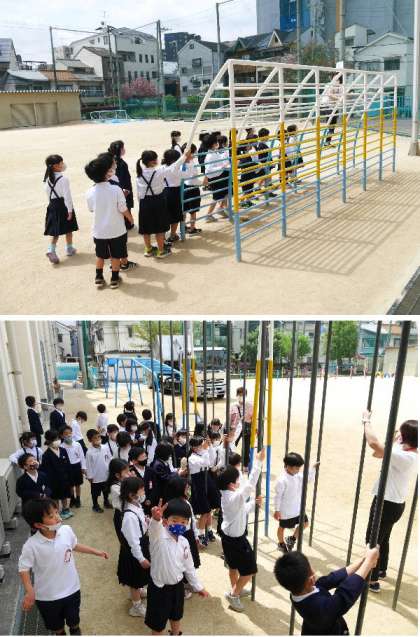 1年生は校舎探検の最後に、運動場の遊具を見てまわりました。お昼休みなどには、みんなで仲良く遊んでくださいね。