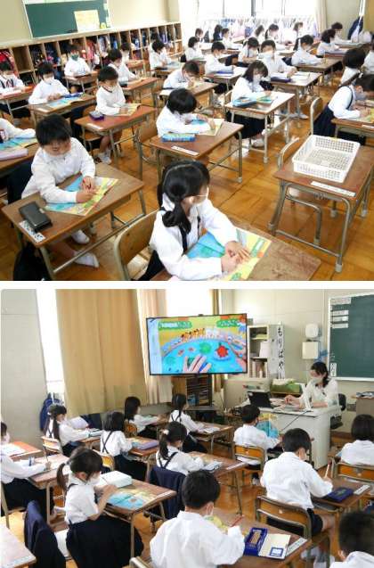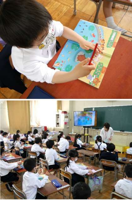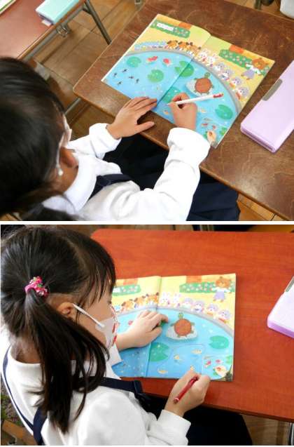 教科書の絵をみて、犬やうさぎ、ねこなど何がいるか赤ペンで囲みました。数をかぞえる練習からはじまっていきます。