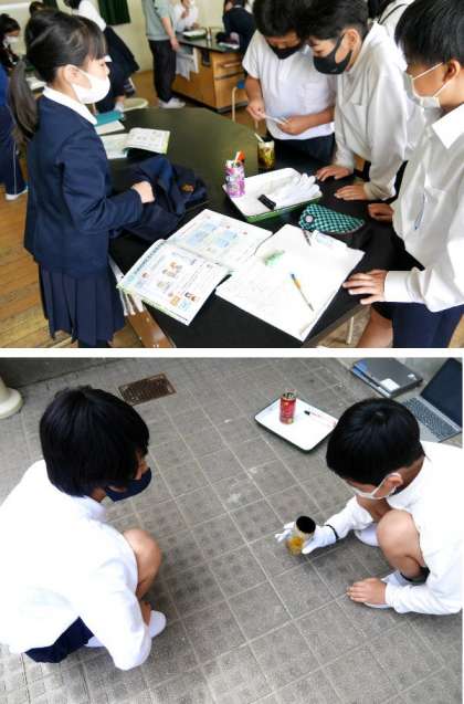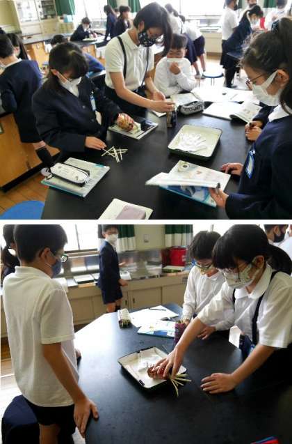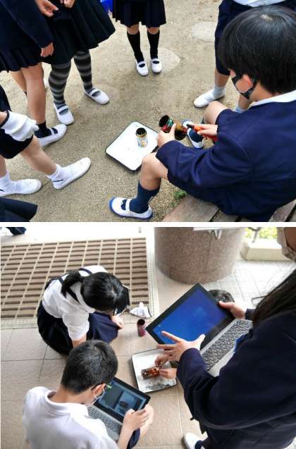 6年生が理科室と玄関で実験観察をしました。ものが燃えるしくみの観察です。わりばしがよく燃えるようにするにはどうしたらいいか確認です。新聞紙も使って火をつけて、タブレットで撮影していました。