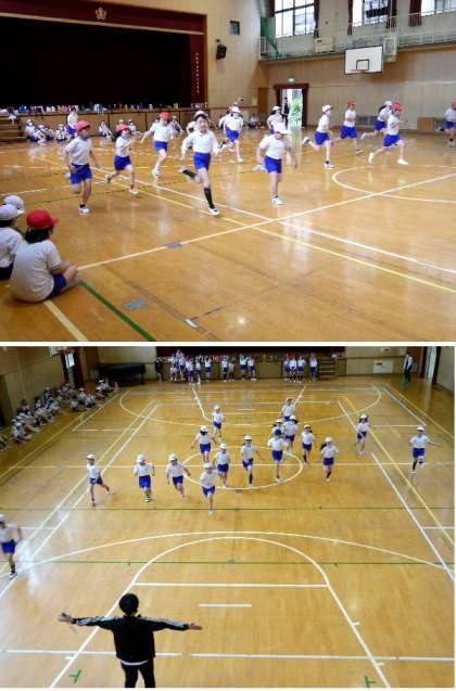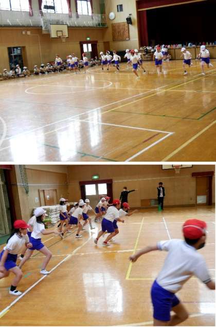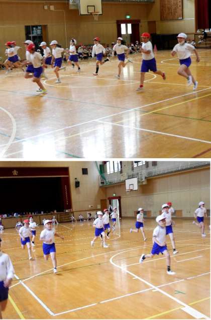 4年生が体育館で、スポーツテストの20mシャトルランの練習をしていました。