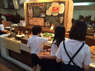 お昼は、papaビアレストランでのバイキング。ここモクモクファームで取れた新鮮な素材を使用した、美味しい料理です。子どもたちは、好きな料理や野菜、飲み物を十分に味わいました。