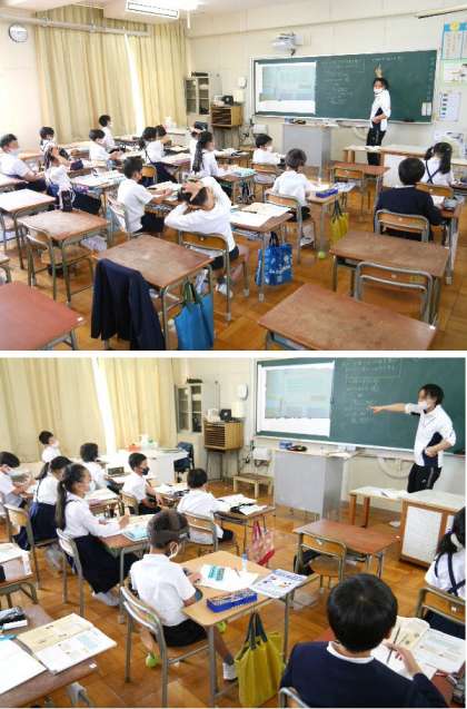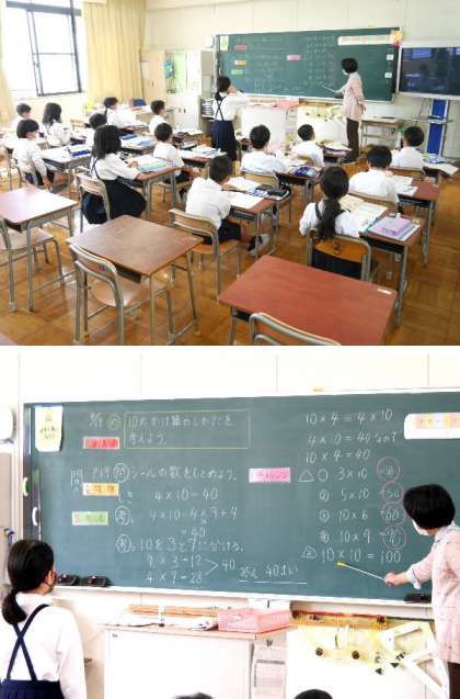 3年生の算数では、クラスを半分ずつにして授業をしていました。10のかけ算のしかたを考えて学習していました。