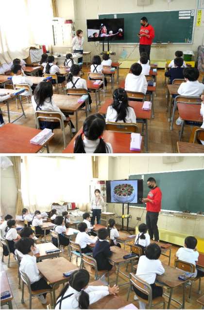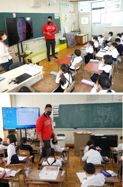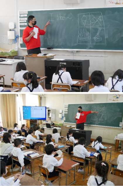 昨年度にひきつづき、英語ネイティブのクリス先生が来てくれました。1年生ははじめての英語の授業でした。クリス先生の自己紹介がありました。「I like〜」を皆で発音しました。自分の好きなものを書いて発表していました。とっても楽しそうに学習していました。