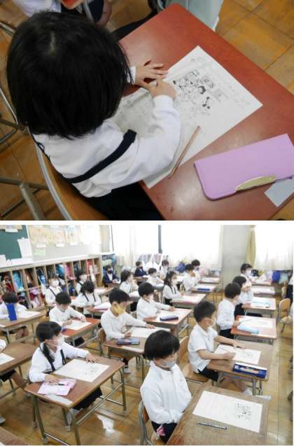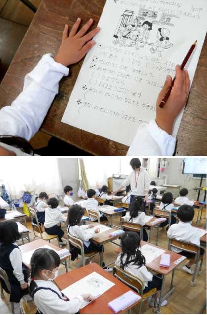 小学校では各教科の単元ごとにプリントによるテストをします。1年生がプリントを読んで〇をつけたり書いたりしていました。少しずつなれていきましょう。