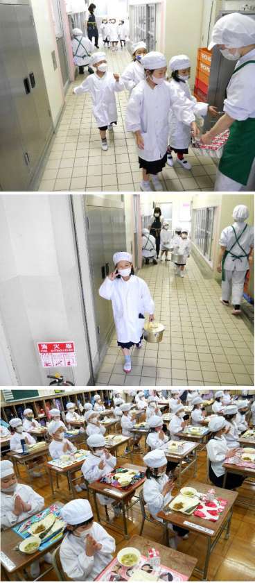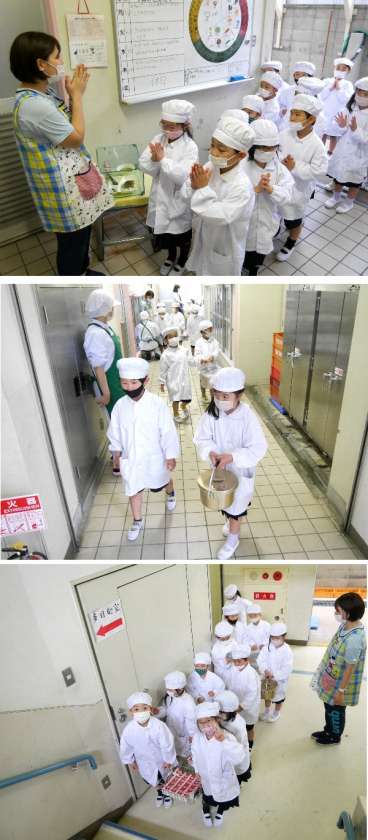1年生の給食は、6年生が食器などをもってきてくれていましたが、今日からは、自分たちで給食室まで取りにいって、自分たちで準備をしていきます。
