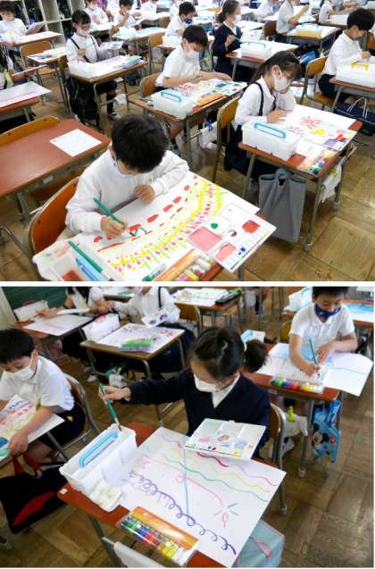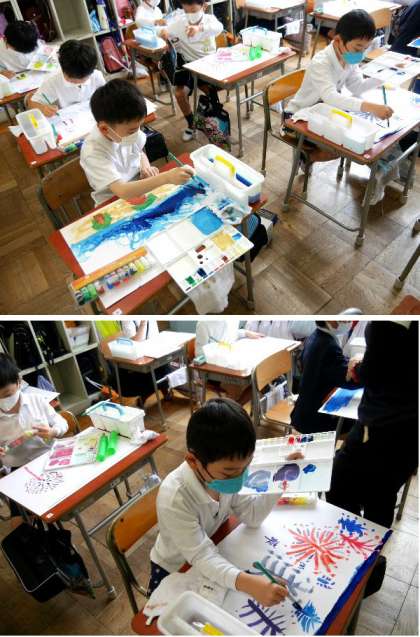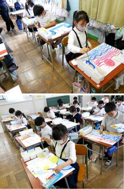 3年生が、絵具を使って絵を描いています。絵具を水でといて、いろいろな点や線で描いています。