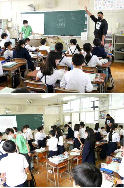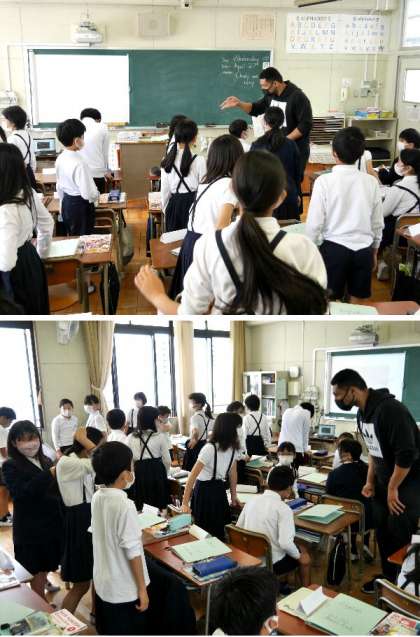 ネイティブのクリス先生が、5年生の英語の授業に参加しています。今日の曜日や日時を英語で確認して、英語であいさつにまわっていました。