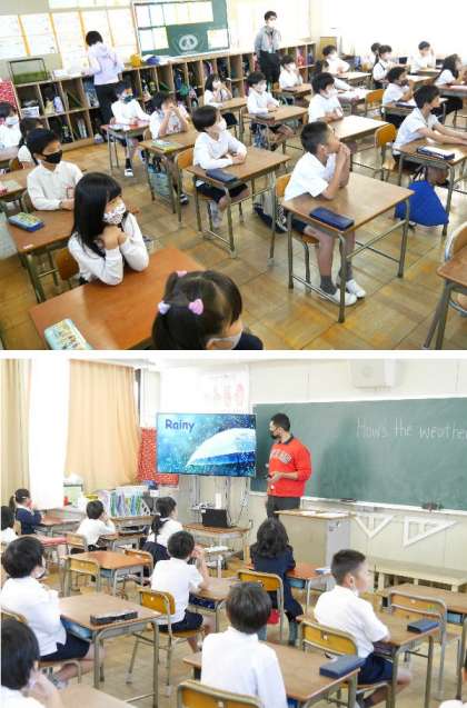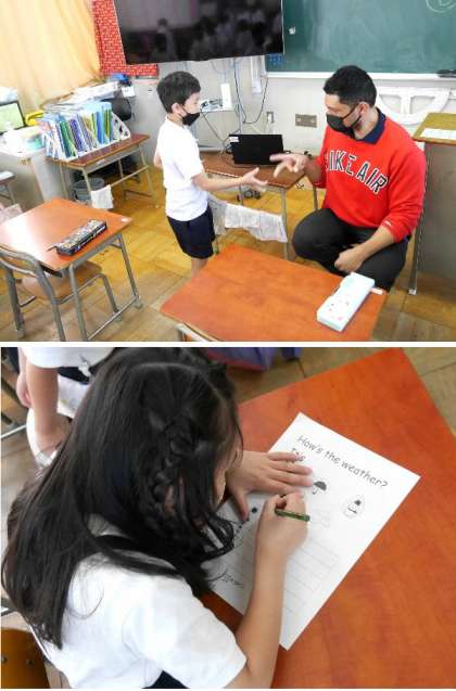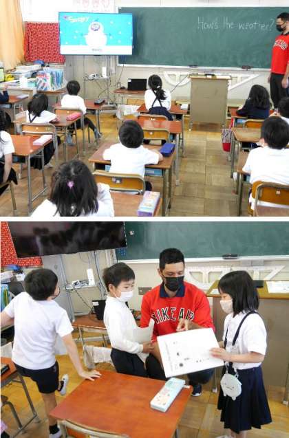 2年生の英語にクリス先生がきてくれました。今回は天気についての質問です。天気について聞きあってプリントに書き込んでいきます。