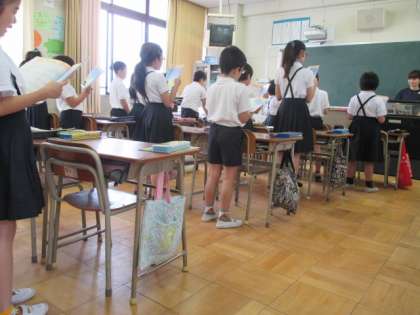 教室で音楽を学習しています。「まきばの朝」を熱唱中です(左)。