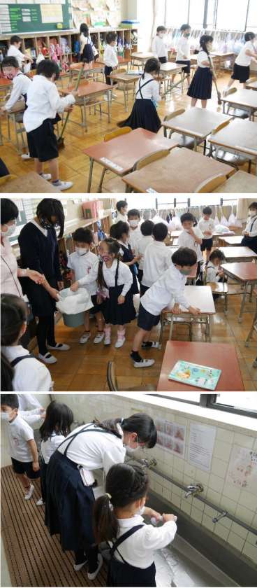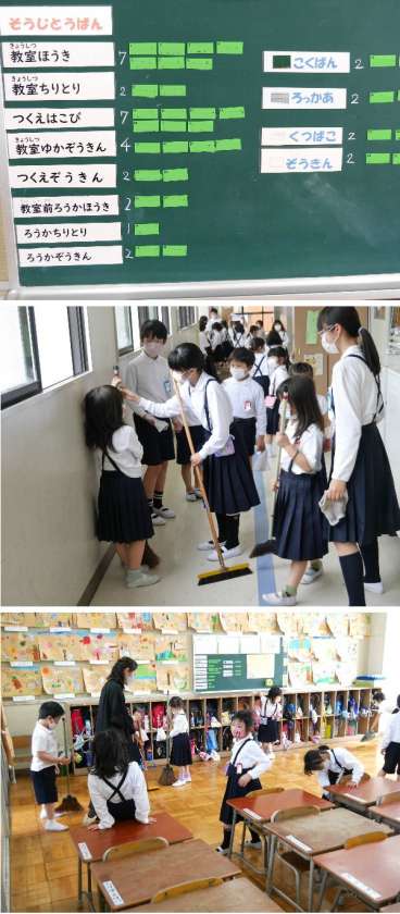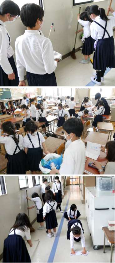 5月6日 1年清掃!6年生がお手伝いに 公開日 2022/05/06 更新日 2022/05/06 学校生活 5月から、1年生は5限目も授業があります。給食をおえて、昼休みのあと、全員で清掃の時間です。6年生がそうじのしかたを教えにきてくれています。長いほうきの使い方などを教えてもらっていました。毎日、みんなで教室をきれいにしましょうね。 いいね(0)