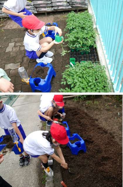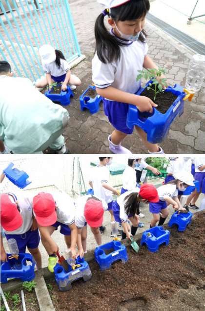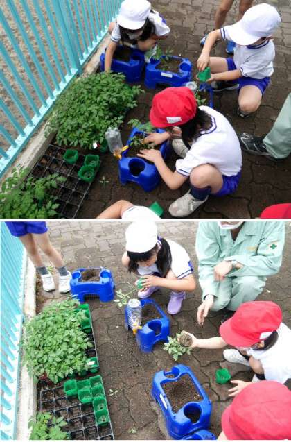 2年生がトマトの苗植えを行いました。昨年使っていたアサガオの鉢に土をいれて苗を植えました。おいしいトマトができるといいですね。