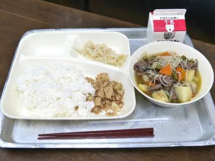 今日の献立は、肉じゃが、もやしのゆずの香あえ、ごまかかいため、ごはん、牛乳でした。