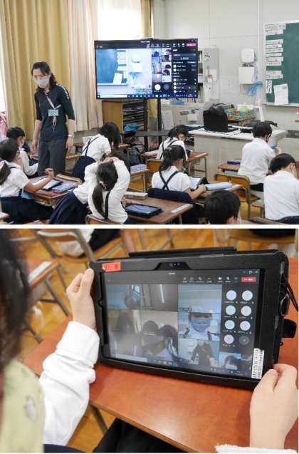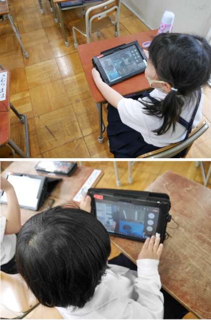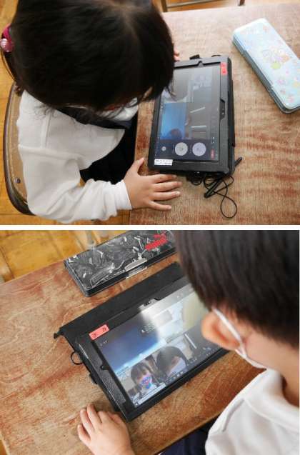 1年生ではタブレットの練習をしています。今日は、オンライン接続の練習をしました。顔がうつると歓声がおこります。