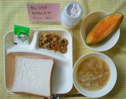 今日の献立は、「カレードリア、キャベツのスープ、クインシーメロン、食パン、マーガリン、牛乳」です。 クインシーメロンは、年に1度だけの登場で1人分は1/8切れです。食べ頃で柔らかく甘みがありました。スプーンですくって食べるのには力がいるので、1年生はちょとずつ時間をかけて食べていました。 クインシーメロンのシーは、ヘルシーのシーです。カロテンなどのビタミンが豊富なくだものです。