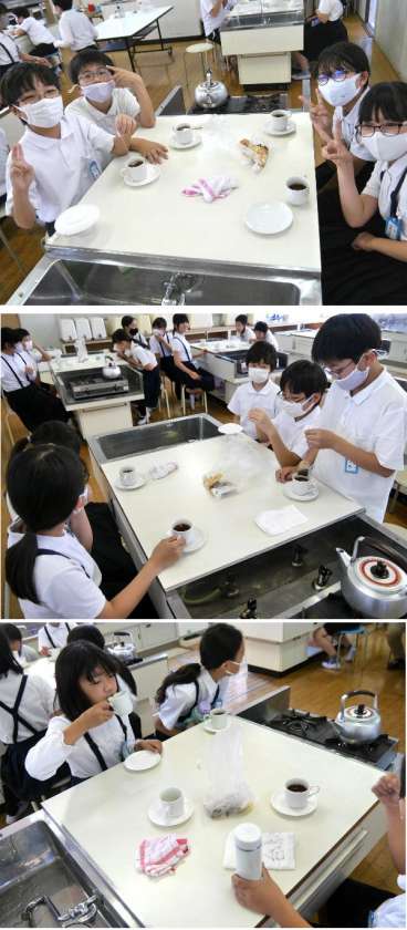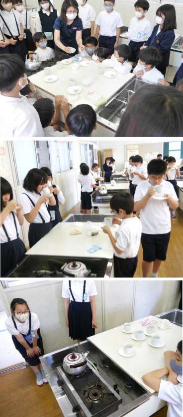 5年生の家庭科では、「お茶」を入れる調理実習です。子どもたちの経験があまりないのか、お茶を入れることもはじめての経験みたいです。おいしいお茶を楽しみました。