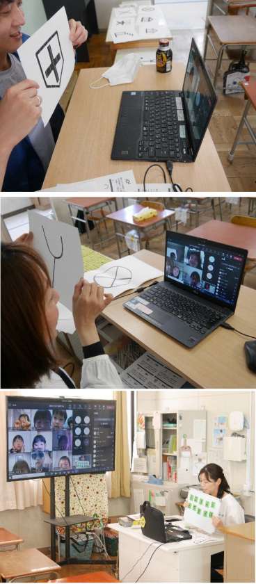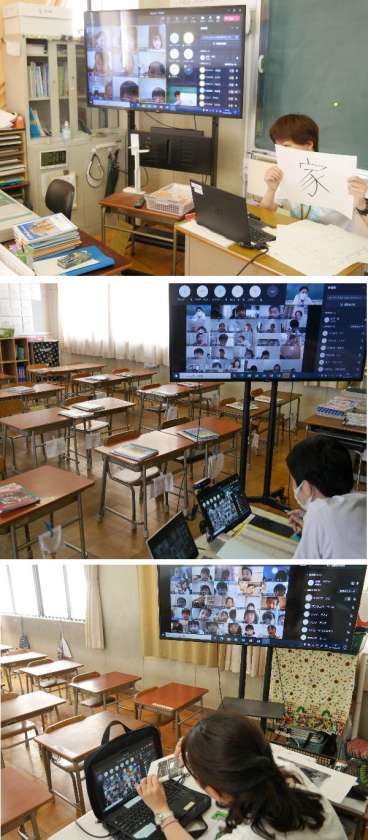 土曜授業で引き取り訓練のあと、学校と各家庭でオンラインで接続して簡単な授業をおこないました。1年生と2年生は初めてですね。オンラインではマスクをしていないので、不思議なかんじです。
