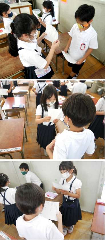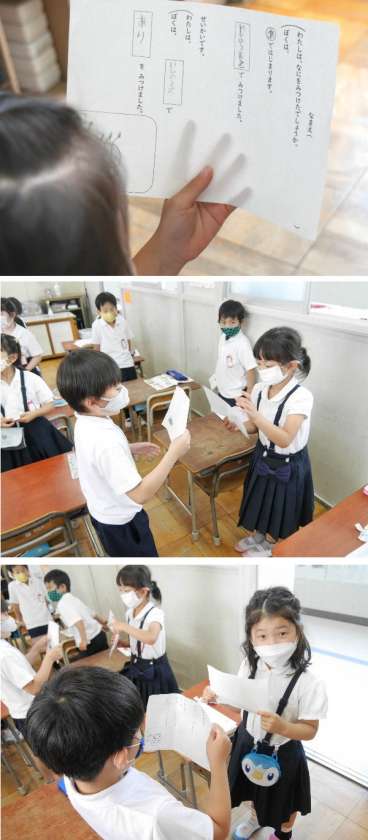 1年生の国語では、みつけたものを、みんなに話をする練習をしています。ペアになってお互いに話をします。昔の国語とはだいぶ変わりましたね。言語活動の充実が求められています。