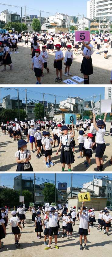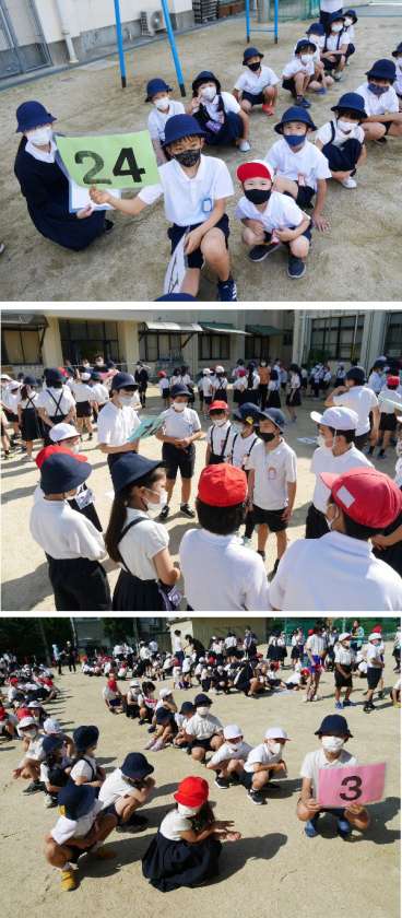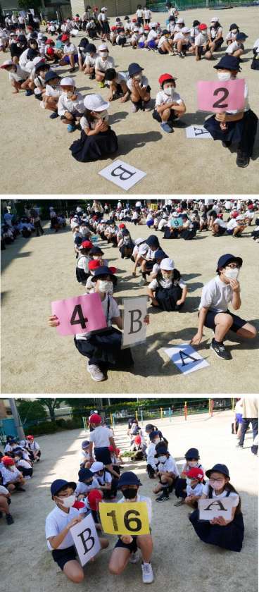 1年から6年生がともに活動する縦割り班の編成をおこないました。6年生のリーダーが班番号カードをあげて待ってくれています。1年生から5年生が、自分の班に集まって、6年生がメンバーを確認しています。