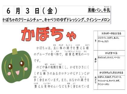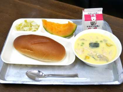 今日の献立は、かぼちゃのクリームシチュー、キャベツのゆずドレッシング、クインシーメロン、黒糖パン、牛乳