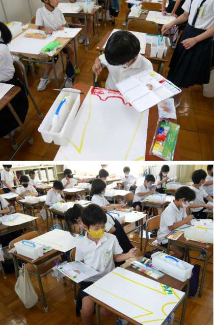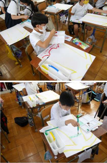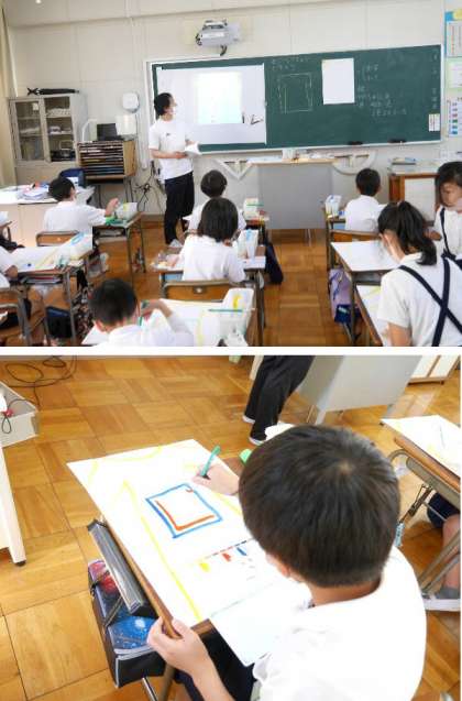 3年生の図工では、オリジナルのTシャツを描いていました。どんなシャツができるかな。楽しみですね。