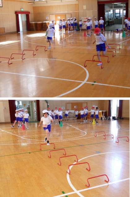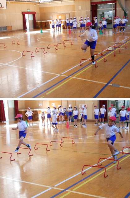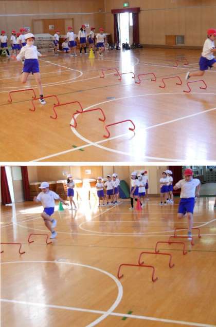 2年生の体育が体育館で行われていました。歩幅を整えて、上手に走りながら飛び越えていきます。結構むずかしそうです。