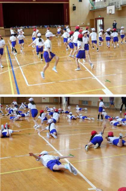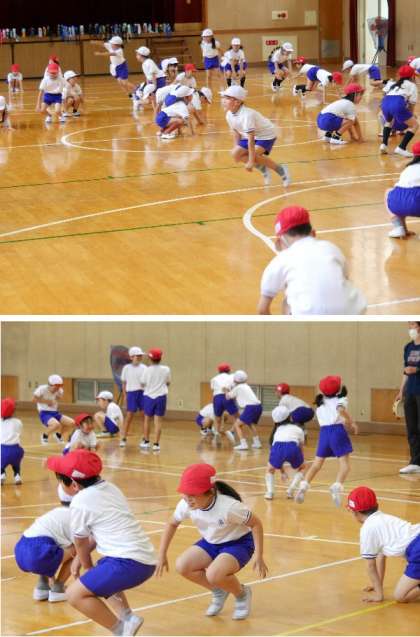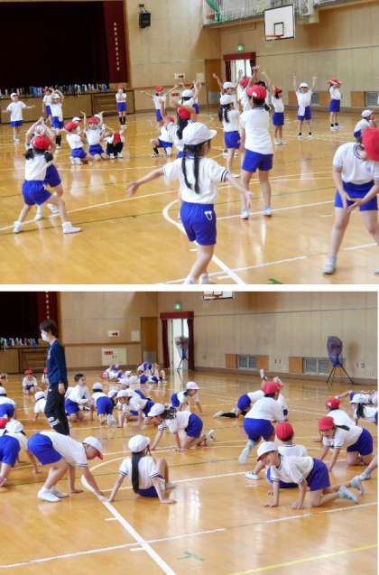 2年生が体育館で、音にあわせて自由に動いています。先生の合図で、カエルになったりペンギンになったり、いろいろなものになって、楽しく運動しています。