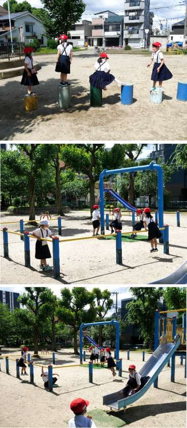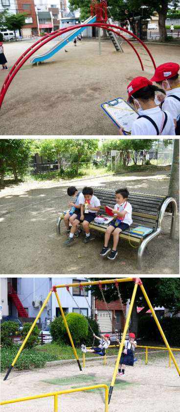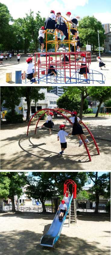 1年生が都島公園まででかけて、公園について調べました。公園たんけんのあと、みんなで遊具で遊びました。たのしかったですね。