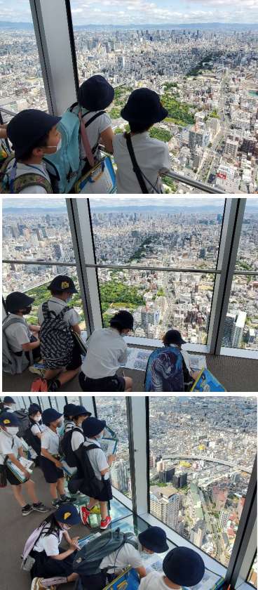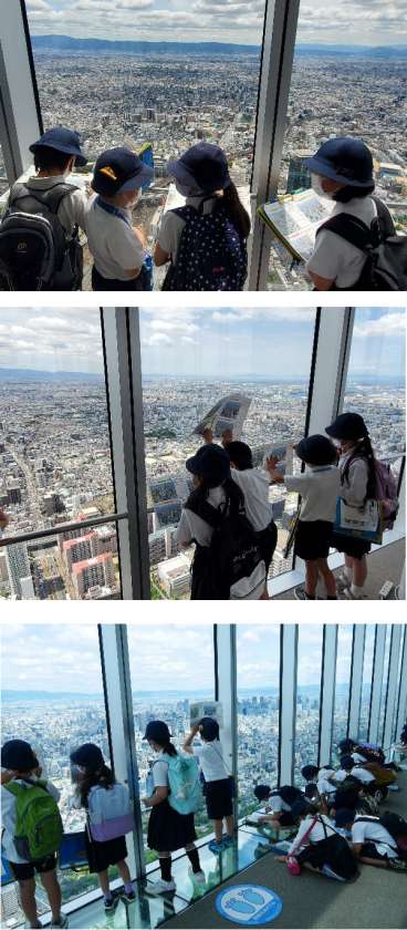 あべのハルカスでは、大阪城や長居公園、京セラドームなど、たくさんの大阪の施設などを見ることができるので、写真をみながら実際に確認をしていました。
