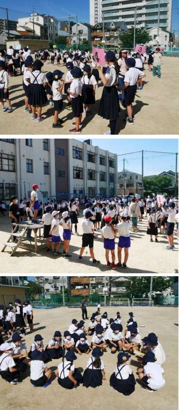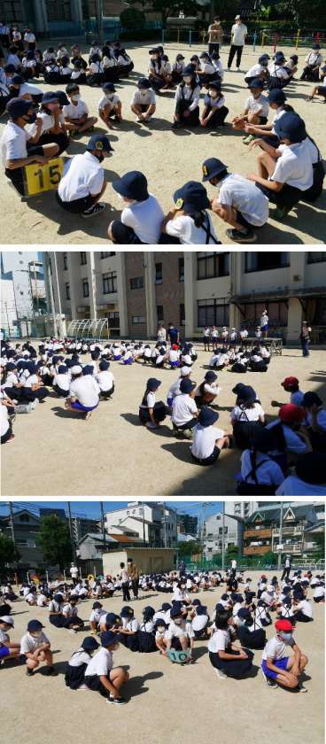今日は、集会委員会による児童集会がありました。先日顔合わせをした縦割り班で運動場に集まって、集会委員会からのクイズに答えます。〇なら班で輪になり、×なら一直線になって座ります。