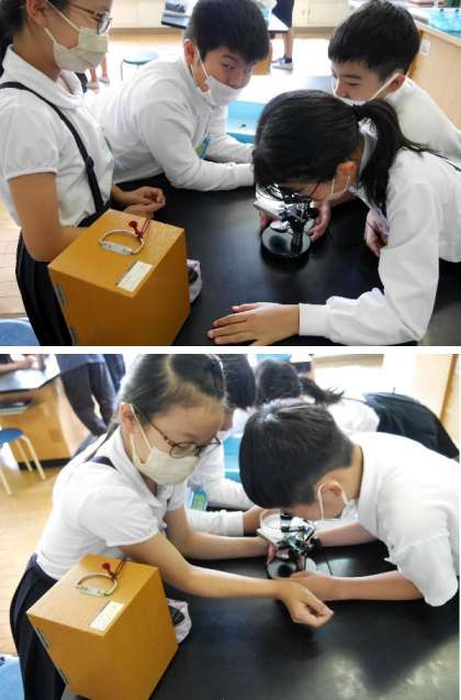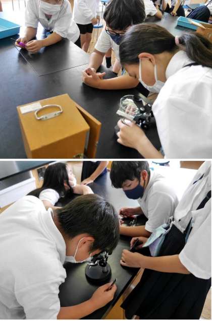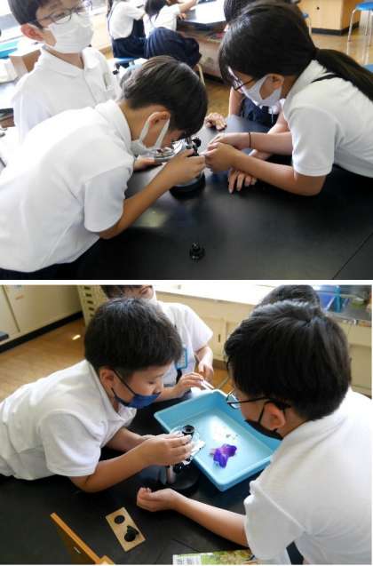 5年生が理科室で、顕微鏡を使って、花粉をみて観察していました。