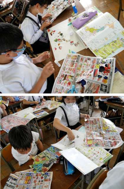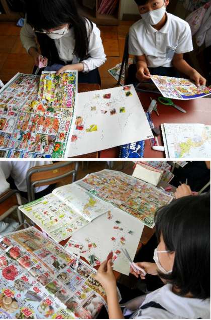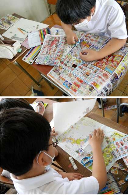5年生が、広告の写真をきりぬいて、日本各地の特産物を日本地図に張り付けてまとめていました。