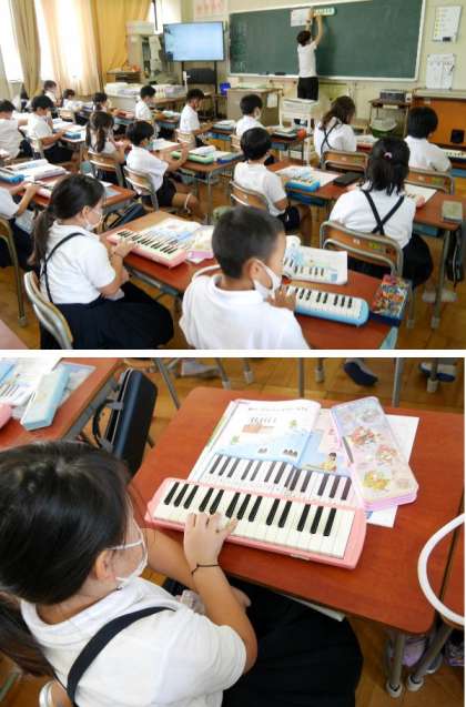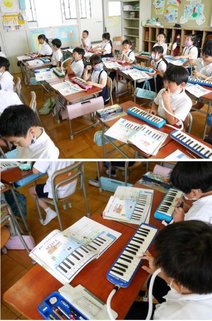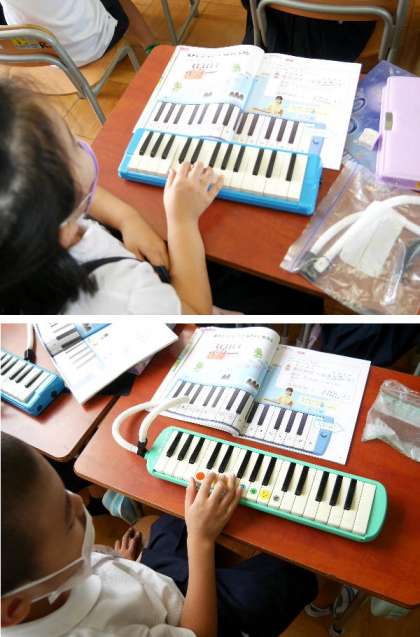 2年生の音楽で、鍵盤ハーモニカの練習が始まりました。まずは、ドレミの練習ですね。息の吹きながら鍵盤を押しての練習です。